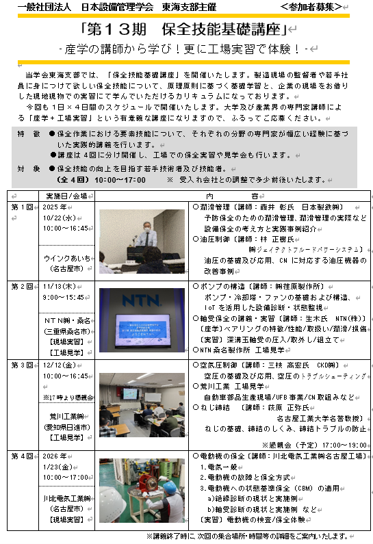 日本設備管理学会 東海支部主催 「第13期 保全技能基礎講座」 参加者募集