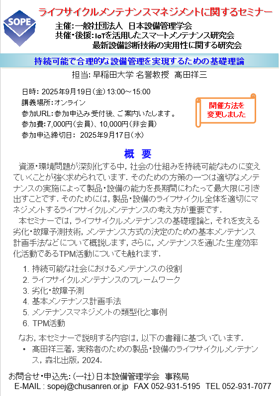Misc 》This Page 日本設備管理学会 主催 「ライフサイクルメンテナンスマネジメントに関するセミナー」参加者募集! 2025年9月12日 コメントはまだありません 250911 高田 ライフサイクルメンテナンスセミナー【改訂版】ダウンロード 開催方式をオンラインに変更、申込み期限を9月17日まで延長しました。参加申込み書は上記からダウンロードして下さい。